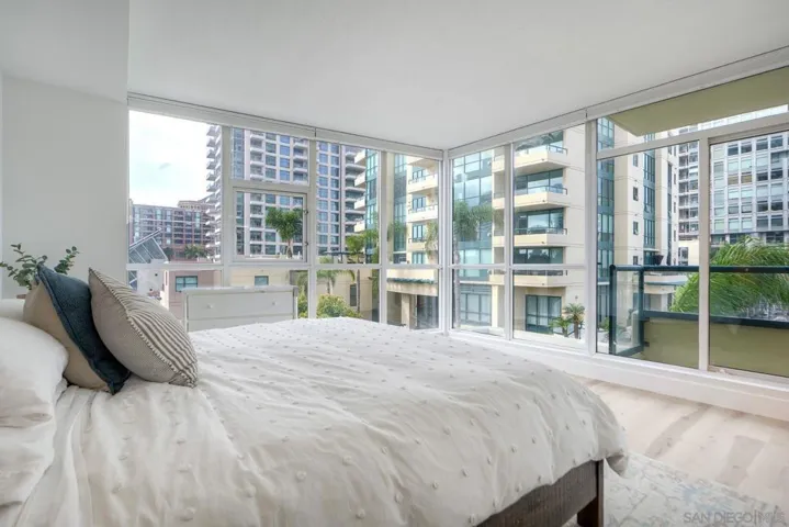 Sky and city views greet you in this beautifully updated home located in the esteemed Horizons South Tower, with floor-to-ceiling windows and a quiet location overlooking courtyard waterfall with lush tropical landscaping. This corner home perfectly blends resort-style living with a vibrant Marina District location. The modern oasis begins when you enter the open floor plan accented by stunning light oak floors, with west-facing sunset views above the renowned architecture of the New Children’s Museum . The meticulously updated kitchen is thoughtfully designed with an oversized custom island and cabinetry, apron sink, high-end stainless-steel appliances including a 5-burner double oven gas range with Wi-Fi and True Convection, and refrigerator with beverage center and dual ice maker. Owner paid EV charger at deeded parking space conveys to buyer! The gorgeous high-end natural finishes and tasteful design continue the oasis ambience of Horizons throughout the home. The primary suite, which includes a large bathroom with soaking tub and second private balcony, overlooks the newly renovated community pool, spa, and BBQ area. The community centerpiece waterfall feature provides a relaxing acoustic backdrop, enhancing your home’s peaceful ambiance. Dual-paned windows, top down-bottom up shades, and a cozy living room fireplace ensure privacy and an intimate living experience, with access to all of the highly-sought after amenities at Horizons. Parking is a breeze for both you and your guests with an EverCharge EV charging station personally dedicated to your parking space, and underground gated parking for your guests. The fitness center, pool/spa and BBQ areas, Billiards room, community room, and elegantly updated lobbies provide plenty of activities and neighbor interactions. Conveniently located in the heart of Marina District, simply step outside into the San Diego Children’s Park to enjoy the year-round coveted weather. Professionally managed by FirstService Residential with 24-hour security and video surveillance, full-time concierge service, and even bicycle storage, you can enjoy your peaceful retreat supported by a community that prioritizes comfort, security, and care. Welcome home to Horizons 305 South