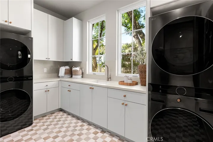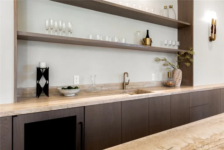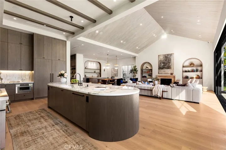 Beyond the bedroom suites, the home offers a dedicated office & a state-of-the-art theatre room designed for a premier cinematic experience. The gourmet kitchen is a true showpiece—anchored by a sculptural rounded-edge island, integrated marble sinks, and a full Thermador appliance suite including a 60-inch gas range with double oven. A fully equipped prep kitchen with its own sink, dishwasher, and pantry adds convenience for hosting or catering support.