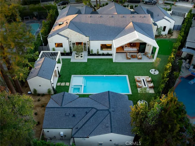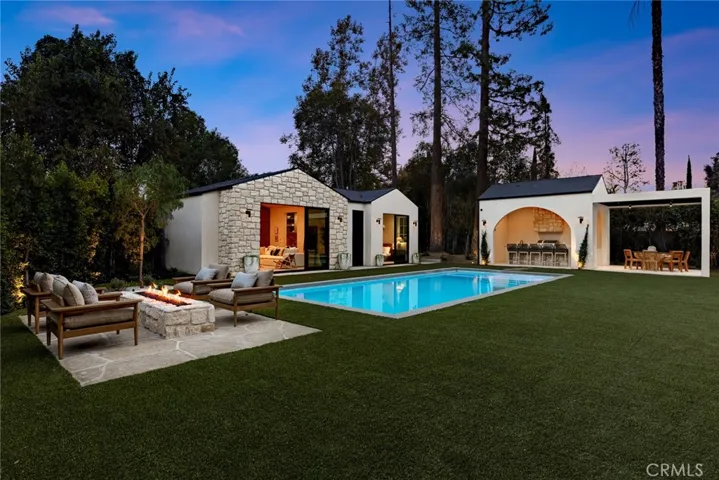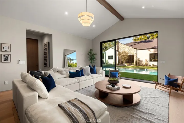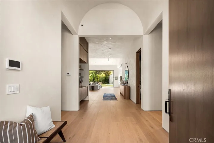 A dramatic barrel-vaulted entry makes a striking first impression. The expansive Grand Living Hall captivates with soaring white oak ceilings, custom built-ins, & wide-plank hardwood floors, opening through walls of glass to the spectacular backyard. The formal dining room enhances the entertaining experience with seamless access to an outdoor fireplace and an elegant custom wet bar, creating a warm yet refined atmosphere for gatherings of any size.