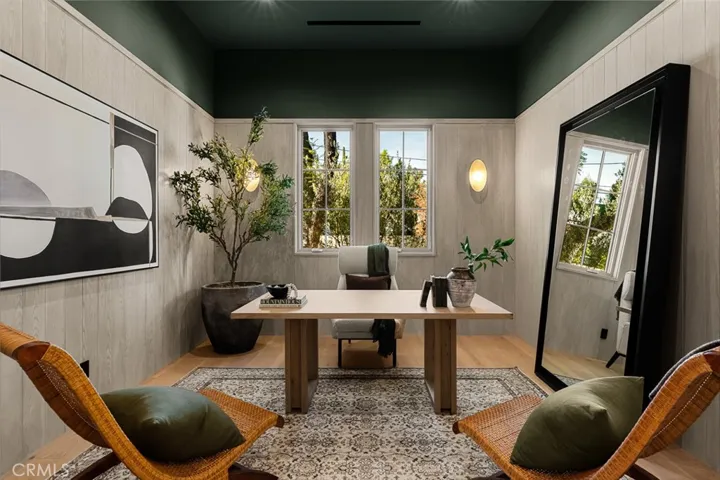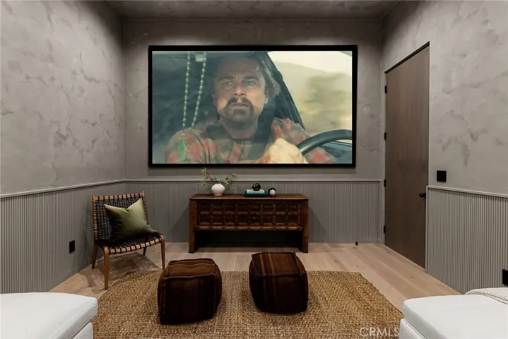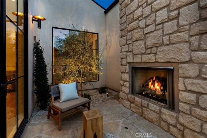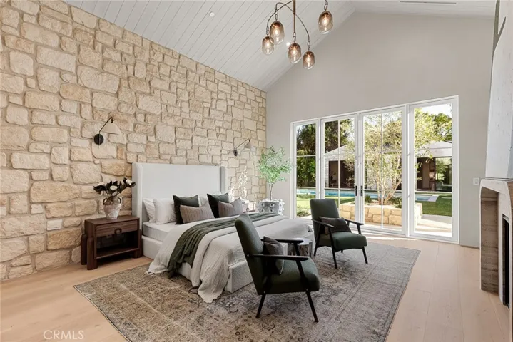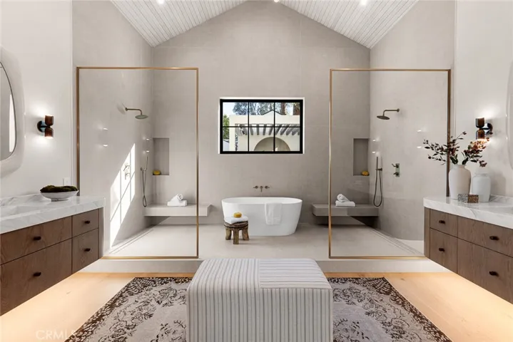 The primary suite is a serene sanctuary with a white oak ceiling, Roman clay walls, a custom stone accent wall, and a sculptural travertine fireplace. The boutique-style walk-in closet with center island offers elegant functionality and generous storage. The spa-inspired primary bathroom features soaring ceilings, a his-and-hers layout, dual-zone showers, a statement soaking tub, two vanities, a dramatic skylight, two water closets, and a dedicated makeup area, creating an open, luxurious retreat for ultimate relaxation.