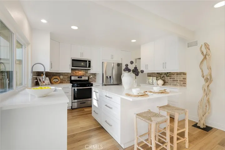Welcome to this stunning single-story, 2-bedroom, 2-bath home nestled in one of Mission Viejo’s most desirable neighborhoods. Freshly painted inside and out and thoughtfully upgraded throughout, this residence offers modern comfort, timeless style, and true move-in readiness. The home features luxury engineered flooring, new LED lighting, and updated fixtures that enhance the light and bright interior. The spacious family room is a standout with its vaulted ceilings and beautifully designed white shiplap accent wall surrounding the fireplace. It is already wired for electrical and sound, making it effortless to mount a TV and create the perfect entertainment space. The remodeled kitchen is filled with natural sunlight, white shaker cabinets, quartz countertops, and offers a generous counter space with an oversized island ideal for gatherings and everyday living. Both bedrooms are spacious and inviting, including a beautifully updated primary suite and a fully remodeled guest bathroom. Additional convenience comes from the large two-car garage with direct access, featuring a dedicated laundry area and plenty of extra storage. This home has been enhanced with valuable upgrades, including a brand-new water heater, PEX repiping, a new air conditioning unit with new ducting, and a new stove and microwave. The front yard features new turf for easy maintenance, while the backyard has fresh sod and provides a perfect setting for outdoor entertaining, play, or relaxation. With 1,212 square feet of beautifully finished living space, this home offers exceptional comfort and convenience. Residents also enjoy access to Lake Mission Viejo, known for its beaches, boating, concerts, and recreational amenities. The location is unbeatable, close to shopping, top-rated schools, parks, and scenic bike trails. This is a rare single-story gem in a wonderful community and an opportunity you don’t want to miss.