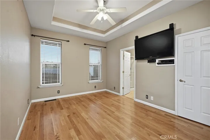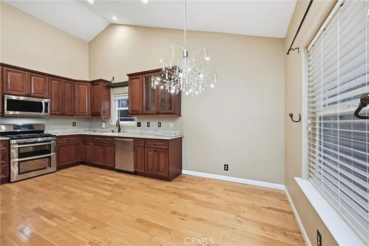 Contemporary Cul-De-Sac Cutie! This upgraded, modern home delivers standout curb appeal and an ideal location—privately tucked away on a small cul-de-sac yet just minutes from local markets, shops, and restaurants. The beautifully landscaped and fully fenced front yard offers exceptional privacy, while the extra-wide driveway provides abundant parking for an RV, boat, or multiple vehicles, in addition to the attached 2-car garage. Step inside to soaring vaulted ceilings and rich hardwood flooring that flows throughout the entire home. The spacious living room features a built-in media center with a mounted TV included. The gorgeous, updated kitchen showcases upgraded cabinetry, newer stainless steel appliances—including a propane range with dual ovens—and granite slab countertops. Adjacent dining area shines with a lovely chandelier and inviting natural light. Retreat to the private primary suite, complete with coffered ceilings, an oversized walk-in closet, dual sinks, granite slab counters, an upgraded vanity area, a large stall shower, and a private water closet. Two additional rooms offer flexibility; one includes custom built-in cabinetry with pull-out drawers in place of a traditional closet. A dedicated indoor laundry room includes the washer and dryer. The fully finished, sheetrocked garage provides excellent storage and workspace. Outside, enjoy a beautifully landscaped and fenced yard plus a bonus storage shed for garden tools or extras. An excellent solar lease is in place, offering significant savings with power purchased at a rate lower than PG&E. Modern, stylish, and move-in ready—this home checks all the boxes for comfort, convenience, and value!