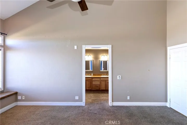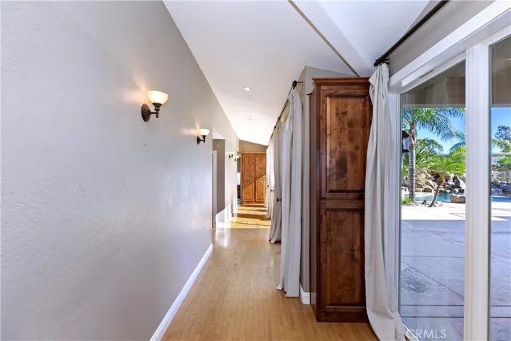 The elegant primary suite is a retreat of its own, featuring a fireplace, wood-beamed ceilings, an expansive layout, and two private balconies overlooking Temecula Wine Country. The luxurious primary bath is beautifully appointed with dual sinks, a spa tub, walk-in closet, and refined finishes. An office with built-ins provides the perfect space to work from home.