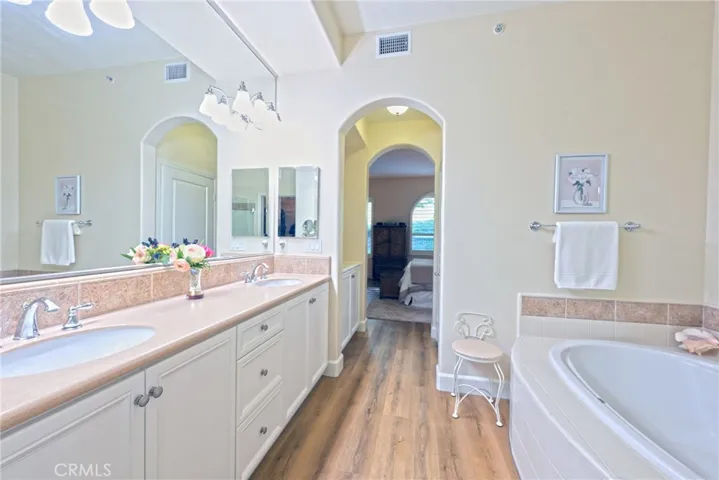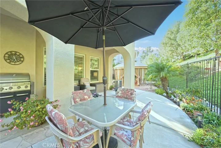 Welcome to luxury living in the prestigious San Lorenzo community of Yorba Linda. This fabulous single-level corner-unit townhome offers 1,702 square feet of beautifully appointed living space, three bedrooms, two-and-a-half bathrooms, and an attached two-car garage. The interior features luxury vinyl plank flooring and plantation shutters throughout, creating a warm and sophisticated atmosphere. The stunning gourmet kitchen features granite countertops, a large island with bar seating, stainless-steel KitchenAid appliances, including a five-burner cooktop, LED recessed lighting, and an abundance of cabinetry. The kitchen opens to an inviting family room enhanced by high ceilings and a charming gas fireplace with logs. The dining room offers high ceilings and a new chandelier. The spacious primary bedroom features an elegant arched window and leads to a luxurious primary bathroom appointed with dual sinks, Corian countertops, a tile backsplash, a large wall-sized mirror with upgraded fixtures, a soaking tub, a frameless glass shower, and a generous walk-in closet with a chandelier. The secondary bedrooms are equally inviting, offering high ceilings and mirrored closet doors. The hall bathroom includes a tub/shower combination with Corian countertops, while the powder room provides a pedestal sink and updated fixtures. Additional conveniences include an inside laundry room with built-in cabinetry and a two-car garage with epoxy flooring and a workbench area. A spacious backyard space with updated landscaping includes a lemon tree and a newer gazebo. Recent upgrades completed in 2020 include the water heater, interior paint, flooring, baseboards, kitchen faucet, garbage disposal, several appliances, and refreshed backyard landscaping—enhancing both comfort and curb appeal. HOA amenities include a swimming pool, spa, and clubhouse. This exceptional property offers upscale living in a serene community close to shopping, dining, and award-winning schools.