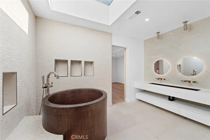 Upstairs, the ocean-view primary suite offers a walk-in closet and a spa-inspired bath with a handcrafted Japanese soaking tub, dual vanities, and an oversized walk-in shower with his-and-her rainfall showerheads.