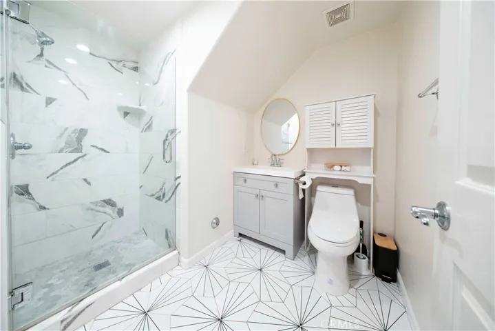 The main level includes a versatile bedroom with a nearby walk-in shower, ideal as a private home office with separation from the main living areas, or perfect for guest use and independent living space.