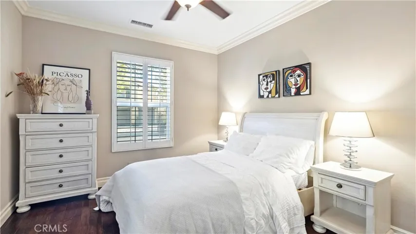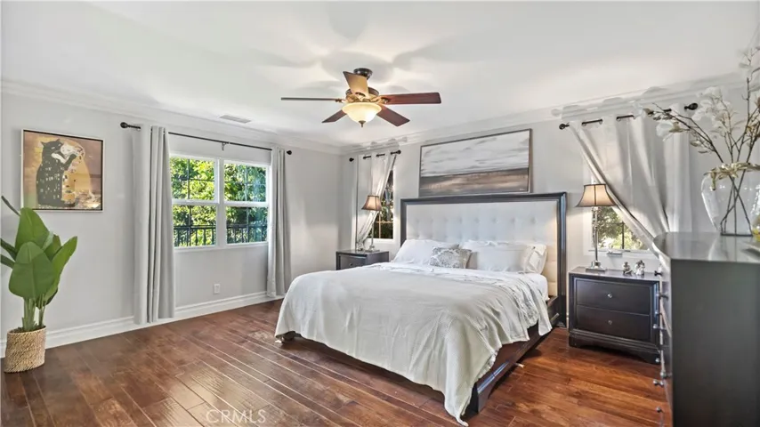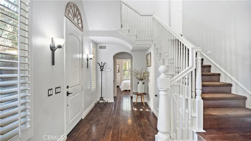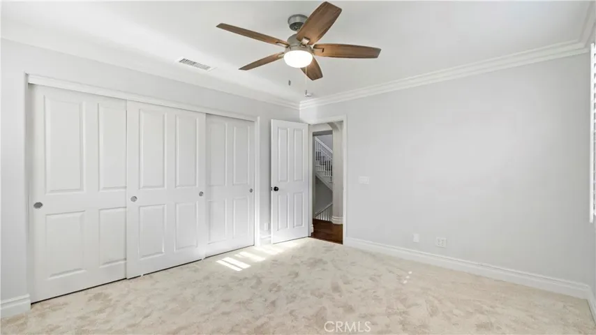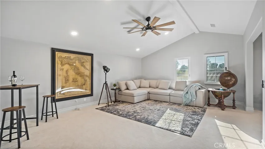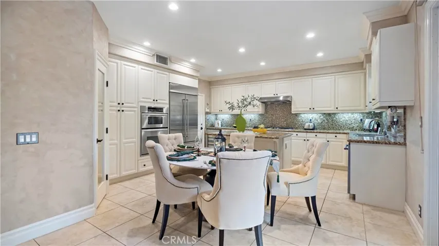 The great room opens to the chef’s kitchen with granite countertops, custom tile backsplash, wine fridge, and stainless-steel appliances. Recent upgrades include newer kitchen and bathroom cabinets, a walk-in pantry, and safety security screens on all first-floor doors and windows. French doors open to unusually large backyard, featuring a BBQ area, water feature, and fire pit—perfect for outdoor entertaining.