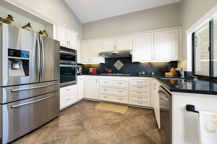 One of the best views in The Lakes Country Club! This residence enjoys a stunning lake setting with a waterfall and a fountain, perfectly positioned along the 7S fairway with a golf-ball-safe orientation. Designer paint is thoughtfully and cohesively used throughout, enhancing the home’s light.The sun-filled living room features vaulted ceilings, a stone fireplace, and built-in shelving and cabinetry. An extended patio with fencing and a built-in BBQ creates an ideal outdoor living space overlooking the lake.The updated kitchen features KitchenAid stainless-steel appliances, upgraded granite countertops and backsplash, and a crisp, polished design that feels both current and functional. A lovely chandelier highlights the dining area. This is a 1-bed + Den currently set up as a bedroom. Both bathrooms have been updated with premium shower enclosures and new toilets. Updated Stone countertops keep it light and fresh with skylights that provide abundant natural light. The spacious primary bedroom features a remodeled walk-in closet and a large en suite bath. The enclosed atrium now serves as a retreat for sitting, with two skylights and beautiful wood-and-glass bi-fold doors to the adjacent Den. The Den is used as a bedroom and features a closet, a custom-built-in desk with shelves, and a door to the bathroom.Additional features include new electric window shades, a Maytag W/D, and new electrical breakers. Upgrades completed in 2022 include a new HVAC system with premium surge and overload protection, a new water heater with recirculating pump, and a 3/4-HP garbage disposal, and ceiling fans throughout.The garage offers epoxy flooring, a new LiftMaster garage door opener with a keypad, and built-in storage cabinetry.An exceptional opportunity to own a beautifully upgraded unit in The Lakes Country Club.