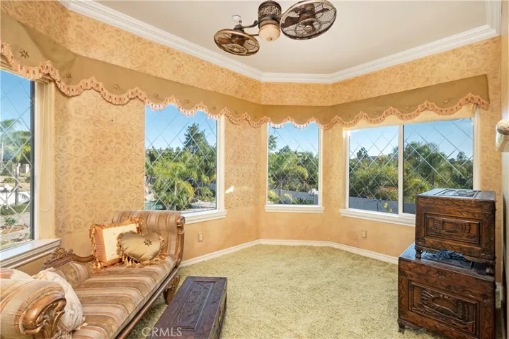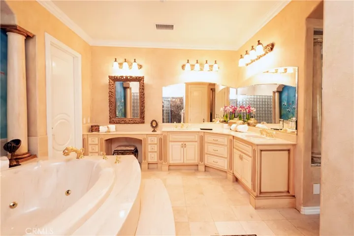 Guests will be captivated from the moment they arrive. Walking past the welcoming sculpture, they’ll enter through double beveled glass doors into a dramatic two-story foyer that takes center stage. Elegant mother-of-pearl inlay adorns the marble flooring, while rope lighting illuminates the soaring space. Surrounding this stunning foyer, discover a music alcove, two versatile bedrooms, a gracious living room, a formal dining room, and a bonus room perfect as library, wine cellar, home office, or bar tailored to your lifestyle. The second floor offers five spacious bedrooms, each thoughtfully positioned for privacy and a designed theater room —that can convert easily to an additional bedroom. The crowning jewel is the opulent primary suite; complete with a private balcony, cozy fireplace, reading nook, luxurious 14k gold bathroom fixtures, makeup vanity, dual sinks, and a walk-in closet with built-in dressers.