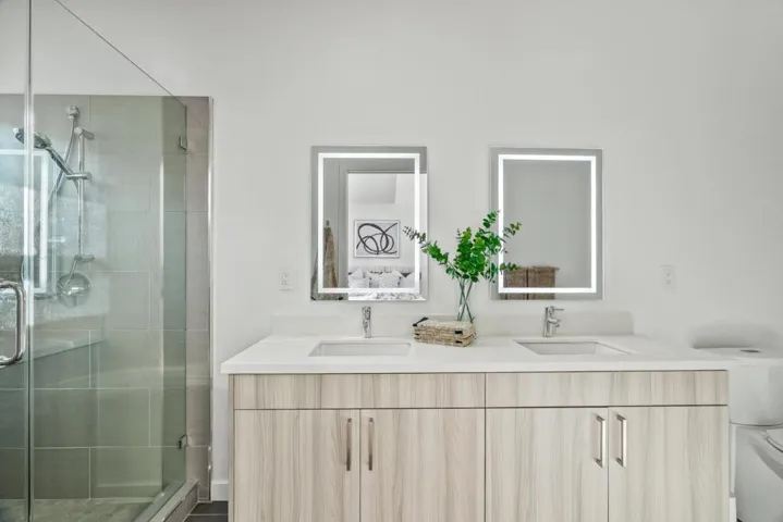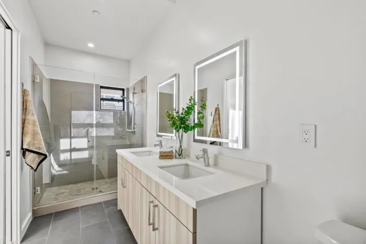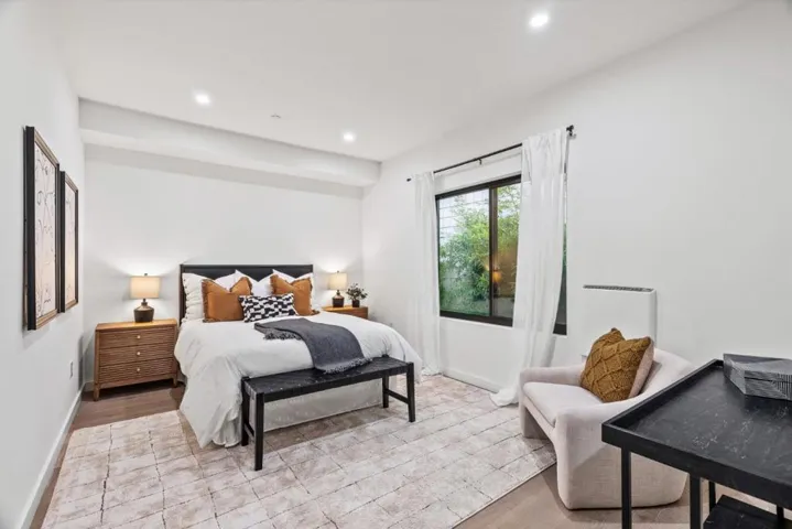 Sophisticated modern living defines 908 Woodside Rd, a beautifully designed 3-bedroom, 3-bath residence offering approximately 1,700 sq. ft. of refined interior space. Thoughtfully crafted with soaring 910 ft ceilings, wide-plank European white oak hardwood floors, sleek glass interior railings, and Level 5 interior wall finishes, this home delivers a polished, contemporary aesthetic throughout. Oversized high-performance triple-pane windows, paired with enhanced insulation between walls and floors, create a serene and light-filled living environment. The gourmet kitchen showcases top-of-the-line Bosch appliances with gas oven/range, quartz countertops with a full-height premium backsplash, custom soft-close cabinetry with dovetail drawers, and elegant under cabinet lighting. Spa-inspired bathrooms feature frameless glass showers, Hansgrohe fixtures, and quartz surfaces. Designed for seamless indoor-outdoor living, the home offers a 96 sq. ft. balcony off the main living area and an additional 170 sq. ft. private balcony off the primary suite. A secured entry gate, fenced perimeter, and attached 2-car garage pre-wired for EV charging complete this exceptional offering.