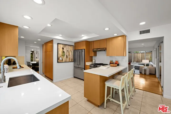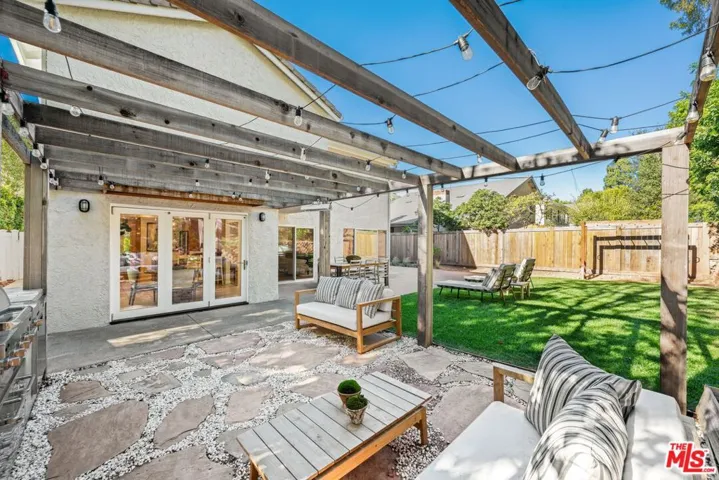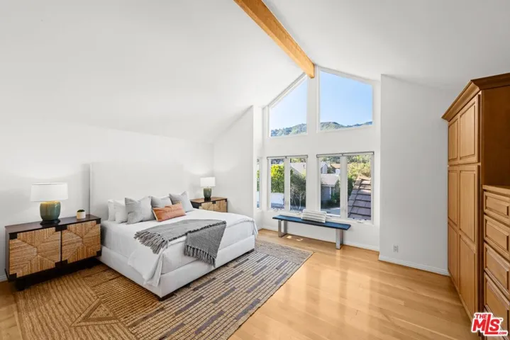 Welcome to an elevated way of life in Pacific Palisades, where coastal beauty meets the effortless sophistication of the Santa Ynez Mountain landscape. Set on a quiet cul-de-sac in the sought-after Palisades Highlands, this impeccably maintained two-level residence offers a rare opportunity to enjoy refined California living with complete peace of mind. Thoughtfully blending timeless comfort and modern elegance, the home spans approximately 2,885 square feet with four beautifully appointed bedrooms and three baths. Upon entry, soaring ceilings and abundant natural light define the expansive living spaces. The formal living room impresses with vaulted ceilings, a gas fireplace, and a wet bar — creating a welcoming setting for both intimate evenings and elegant entertaining. An adjacent dining room provides the perfect backdrop for memorable gatherings. Further in, a separate family room flows seamlessly to the backyard through sliding glass doors, offering effortless indoor-outdoor living. An artfully curated wood staircase anchors the home’s architectural presence, while special moments throughout — including the bar area and fireplace — add warmth and character. At the heart of the home, the remodeled kitchen showcases custom wood cabinetry, stone countertops, premium appliances, a pantry, and a charming garden window. A casual breakfast area opens to a pergola-covered flagstone patio with a built-in BBQ, ideal for relaxed entertaining and alfresco dining. Upstairs, all four bedrooms are thoughtfully arranged to create a private, serene living experience. The primary suite is a true sanctuary, featuring beamed vaulted ceilings, dramatic picture windows framing the Santa Ynez Mountain range, and exceptional storage with a walk-in closet plus two additional closets. The spa-inspired ensuite bath offers dual vanities, a deep soaking tub, and a glass-enclosed tile shower. The additional bedrooms are impressively spacious and versatile — one currently styled as a refined home office with a built-in desk — while the others provide generous, sunlit retreats for family, guests, or personal wellness spaces. These bedrooms are supported by a beautifully appointed full bath with a double-sink vanity and tub/shower combination, designed for comfort and ease. Every element of the home has been curated to support a gracious, elevated lifestyle. Exceptional storage is woven throughout, complemented by modern enhancements including dual-zoned heating and air conditioning, and a new sewer line. The upgraded spacious 3-car garage features new springs and a new opener and offers direct entry for added convenience. Outdoors, a lush hillside backdrop with no rear neighbors ensures privacy. The backyard features a grassy lawn and fruit trees, open patios for lounging or dining, and a built-in BBQ and beverage refrigerator perfect for year-round enjoyment. Adding to the lifestyle appeal is a membership to the nearby Santa Ynez Recreation Center, offering a beautiful Santa Ynez Recreation Center which features a 75 foot lap pool, children’s pool and jacuzzi, three lighted tennis courts, pickle ball courts, a playground and play structure, a clubhouse with full kitchen, gym, a large screen entertainment system, 7-foot Imperial eliminator pool table, ping pong table, and foosball table, a pool house with four showers and vibrant landscaped community spaces. With hiking and biking trails just moments away and Palisades Village only minutes from home, this residence captures the essence of Pacific Palisades living. A home designed not just to live in — but to truly cherish!