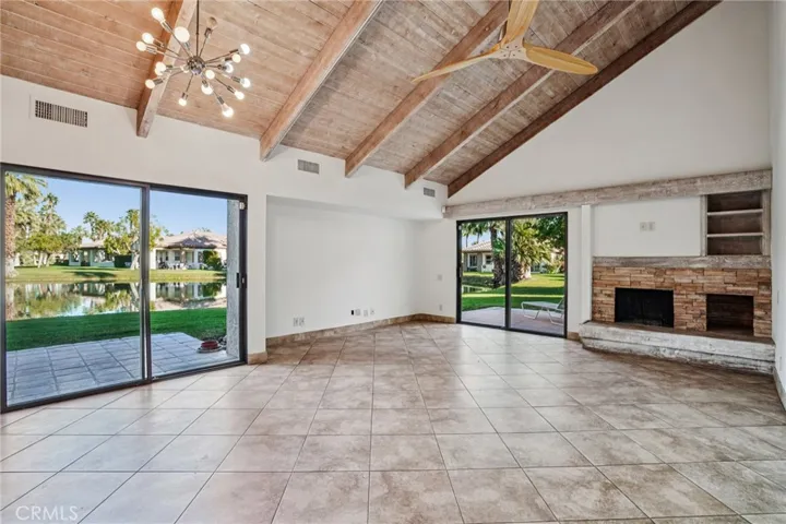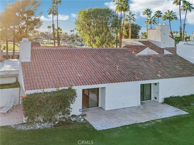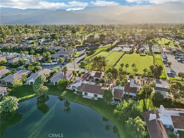 Welcome to 380 Wimbledon Drive — a beautiful 1 bedroom, 1.5 bath single level retreat perfectly situated along the lakefront in the heart of the prestigious Mission Hills Country Club. This 1,049 sq ft home exudes resort style sophistication with soaring wood beamed ceilings and an open concept layout that flows effortlessly onto multiple private patios, where walls of glass invite natural light and frame panoramic views of the serene lake and surrounding mountains.