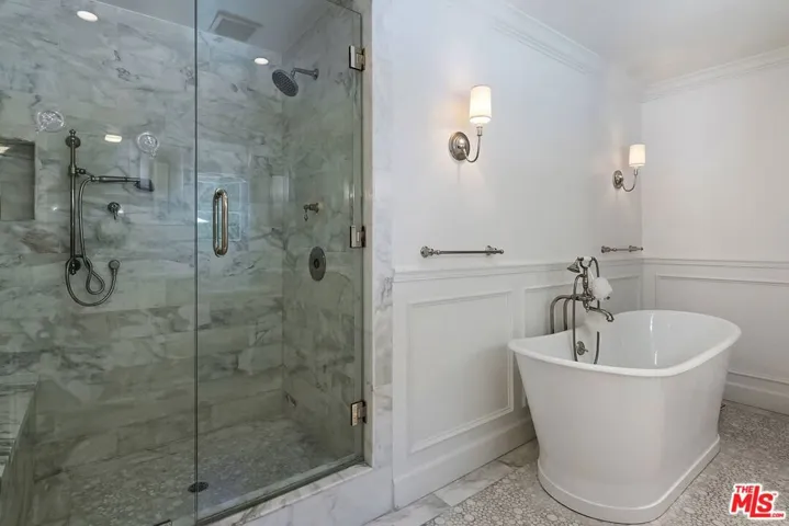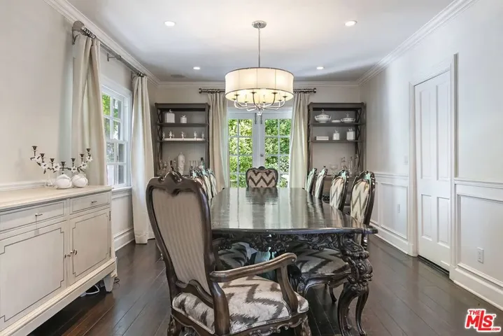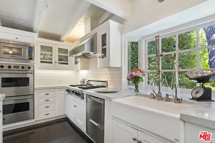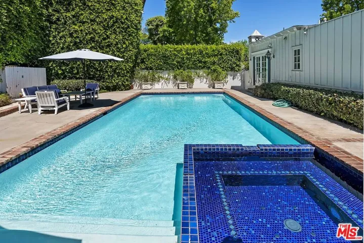 This exceptional 4-bedroom, 4-bath Westwood Hills Traditional is gracefully sited on an expansive double lot, blending classic 1930s charm with thoughtfully executed updates that honor the home’s original architectural integrity. Instantly inviting, the property showcases storybook curb appeal with a welcoming brick porch, arbor, and classic white picket fence. Inside, rich hardwood floors run throughout, setting the stage for a formal entry that opens to a grand living room highlighted by a soaring vaulted, wood-beamed ceiling and a striking fireplace. The home is filled with warmth and character, complemented by distinctive ironwork and a stylish wet bar that enhances its timeless appeal. Across from the living room, the family room flows seamlessly into a beautifully appointed chef’s kitchen featuring a wood-beamed ceiling, Carrara marbletopped island, farmhouse sink, and built-in breakfast nookperfect for everyday living and entertaining. A formal dining room adds to the home’s gracious layout. A short set of steps leads to a cozy library or den, complete with the original corner brick fireplace, offering a perfect retreat. The en suite primary bedroom is a true sanctuary, featuring its own fireplace and a walk-in closet. Two additional bedrooms share a full bath, complemented by a powder room and a versatile bonus space ideal for a playroom, office, or study. Outdoors, the expansive backyard offers large, open grassy and patio areas designed for both relaxation and gatherings. Additional amenities include a separate en suite studio, laundry room, and a pool and spa. Ideally located within the highly sought-after Warner Avenue School District and just moments from UCLA and Westwood Village, this home offers a rare combination of character, space, and prime location.