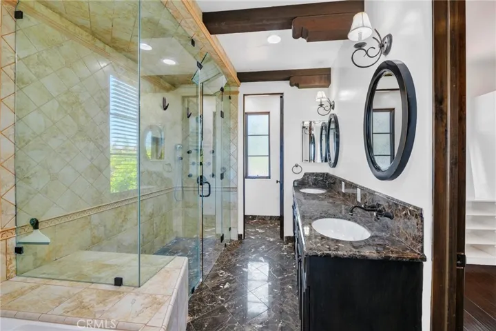 This fabulous Spanish Hacienda has everything you need. The two story home has a finished basement and a roof deck. The living space is made up of 2749 square feet. The basement is 1570 square feet and has a full bath, wet bar, and endless opportunities. The covered patio makes up 533 square feet and rest of the patios and balconies make up 500 square feet. The 239 square foot roof deck boasts panoramic ocean views, as well as views of the city and the Palos Verdes hills. The builder spared no expenses, using blue lumber (mold & termite resistant), mold-resistant drywall, tankless water heaters, wood windows, custom-made cabinets, distressed wood floors, and Spanish-style pavers. The dramatic entryway is made up of beautiful arches and wood beams/corbels. The extra-large kitchen has a center island with a sink and Viking appliances, including a fridge and two dish washers. There are two master bedrooms–one on each floor. The outdoor fireplace on the covered patio is a perfect entertaining space. If you’ve always wanted a custom home in the Riviera, this one’s for you. Please note that the view is only from the roof deck.