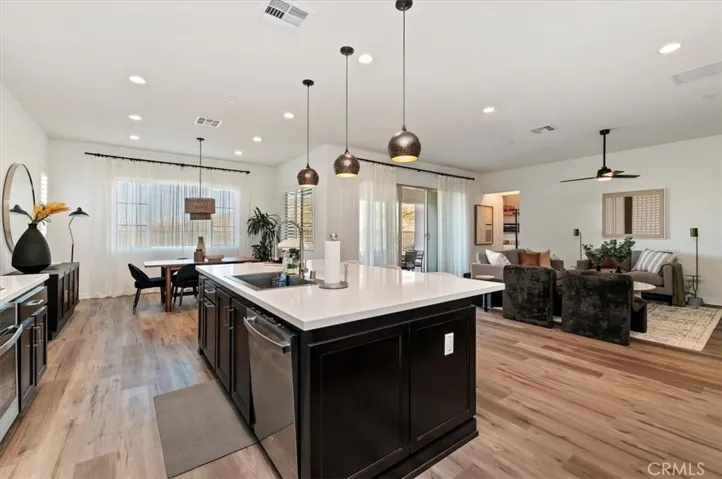 The light-filled open floor plan features 9-foot ceilings, luxury vinyl plank flooring throughout, and a spacious living, dining, and kitchen area perfect for entertaining. The kitchen includes a large center island with seating, walk-in pantry, recessed lighting, and ample cabinetry.