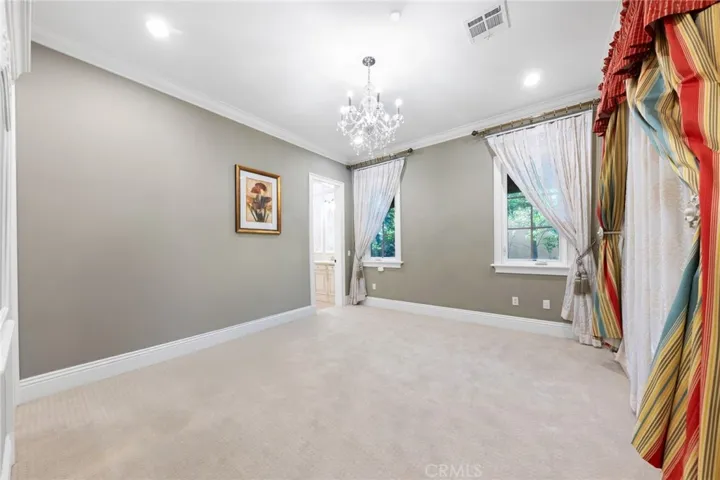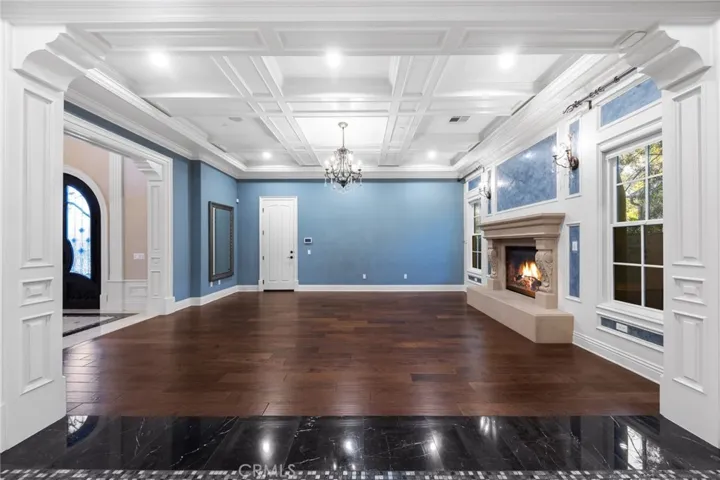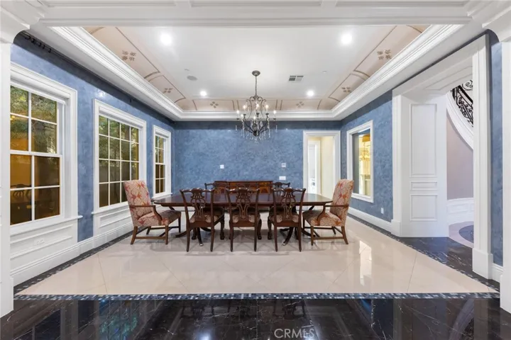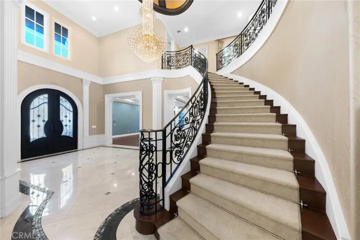 Beyond grand double iron doors, the home welcomes you with a dramatic two-story foyer featuring elegant marble flooring, a statement crystal chandelier, and a sweeping wrought-iron staircase that sets an immediate tone of refinement.