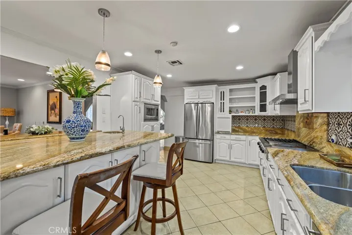 Inside, the home offers a bright and functional floor plan with abundant natural light, hardwood flooring, and elegant finishes throughout. The spacious living room features a classic fireplace and flows seamlessly into the dining and family areas, making it ideal for both everyday living and entertaining. The updated kitchen is equipped with granite countertops, custom cabinetry, tile backsplash, stainless steel appliances, and generous counter space.