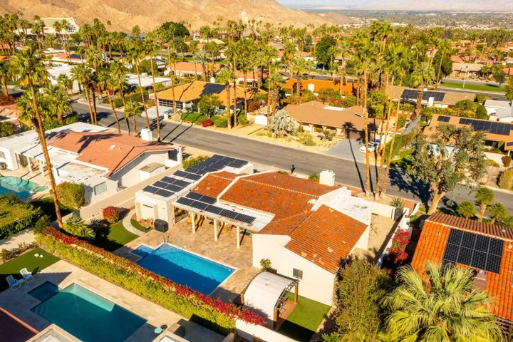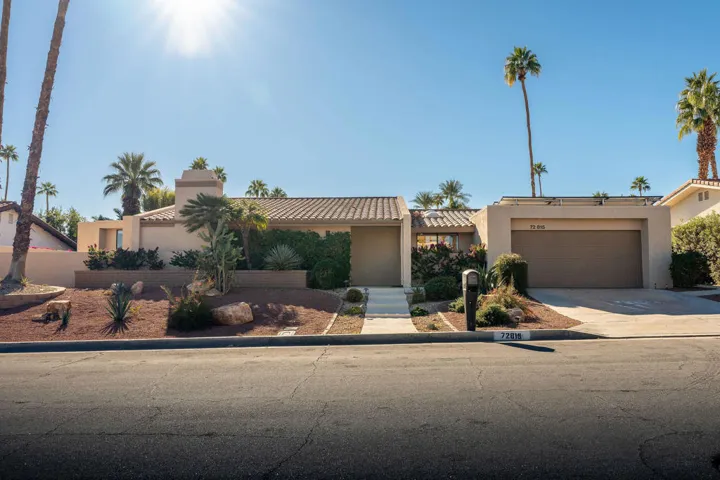 An exceptional South Palm Desert residence, fully reimagined through a complete down-to-the-studs renovation in 2021, offering refined desert living with modern systems, thoughtful design, and owned solar–all in a desirable non-HOA setting. This south-facing home was entirely rebuilt to today’s standards, including new interior walls, ceilings, flooring, roof, fireplace, appliances, hot water heaters, and a new garage door and opener, resulting in a property that lives with the ease and confidence of newer construction. Expansive living spaces are filled with natural light and defined by soaring ceilings and exposed beams, creating a sense of volume and architectural interest. The custom kitchen serves as the centerpiece of the home, featuring a large granite island with seating, a commercial-style gas range, and seamless flow to the surrounding entertaining areas. A built-in wet bar with beverage and wine coolers enhances both daily living and hosting. Outdoors, the private backyard offers a resort-style experience with a striking glass-tile pool and spa, expansive imported travertine decking, and a gazebo perfectly positioned to enjoy mountain vistas and dramatic desert sunsets. The primary suite is a true retreat with direct access to the backyard and a spa-inspired ensuite bath complete with a standalone soaking tub and walk-in closet. Two additional guest suites each feature their own ensuite baths, providing comfort and privacy for guests or extended stays. Porcelain tile flooring runs throughout the home for a clean, cohesive aesthetic and easy maintenance. Owned solar, installed in late 2021, delivers outstanding energy efficiency and meaningful long-term savings. Surrounded by low-maintenance desert landscaping and ideally located near El Paseo’s renowned shopping, dining, golf, and hiking, this home offers a rare blend of luxury, privacy, and modern desert sophistication.