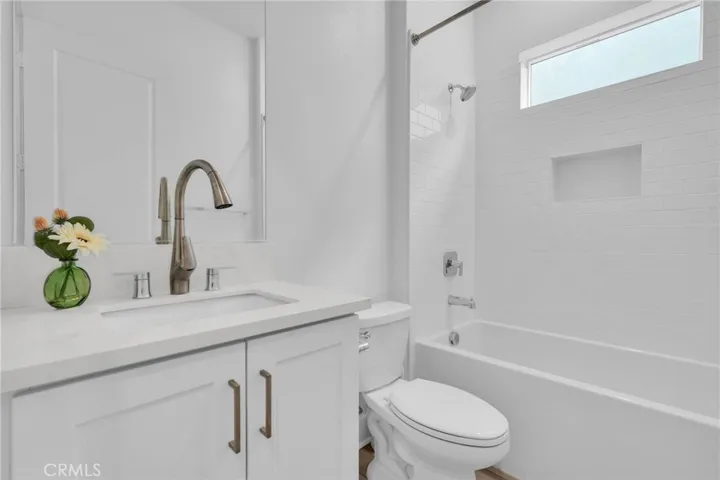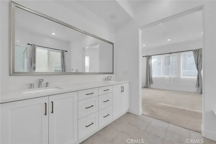 The primary suite is generously sized and includes a spa-inspired bathroom with dual sinks, a soaking tub, a separate glass-enclosed shower, and a large walk-in closet. Secondary bedrooms are well proportioned and versatile for guests, family members, or a home office.