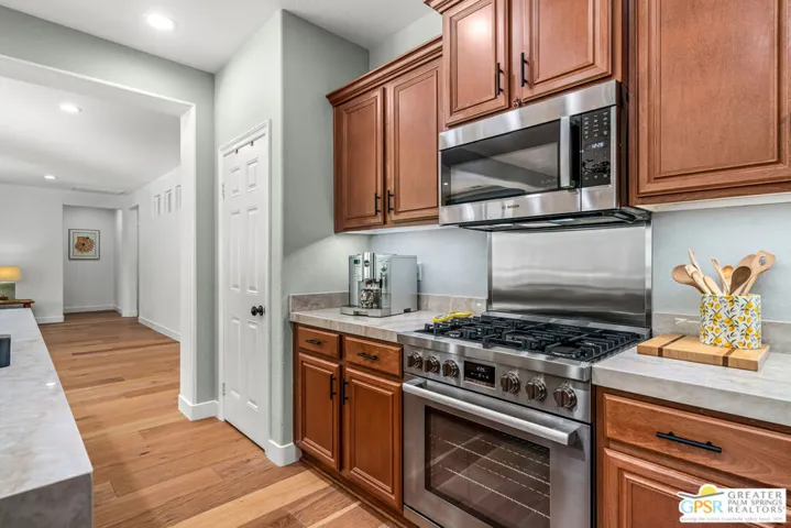 Welcome to a beautifully upgraded and meticulously maintained Palm Desert residence that still shows like a former model home. Offering approximately 2,350 square feet of refined living space on a premium, private southwest-facing lot of approximately 11,326 square feet, this home blends timeless design with modern convenience. The thoughtfully designed floor plan features two spacious primary bedroom suites, each with a private bath and walk-in closet, as well as a third bedroom that has been converted into a dedicated entertainment room with a large-screen TV. Ceiling fans throughout the main living areas and bedrooms provide year-round comfort. The entire interior has been recently repainted in a light, neutral palette, creating a bright and welcoming atmosphere. Real oak wood flooring flows throughout the living areas, kitchen, hallways, and bedrooms, while tile flooring remains in the bathrooms and laundry room. The remodeled kitchen is a standout, showcasing Bosch appliances, including a convection microwave, a refrigerator with filtered water and ice maker, premium countertops with a waterfall edge, an upgraded island, and a reverse osmosis instant hot/cold water system. The laundry room has also been upgraded with new cabinetry, quartz countertops, sink, and washer and dryer. The private backyard has been completely redesigned for relaxed desert living and entertaining, featuring a lap pool with an automatic electronic cover, a covered awning with ceiling fans, stone and paver hardscaping, new landscaping with night lighting, and a stone wall along the west side of the pool. Additional highlights include an owned solar system that significantly reduces energy costs, a Tesla electric car charger in the garage, which is climate-controlled and equipped with a high-efficiency heat pump; a comprehensive Ring security system; plantation shutters on most windows; and new interior and exterior shades for the west-facing windows.