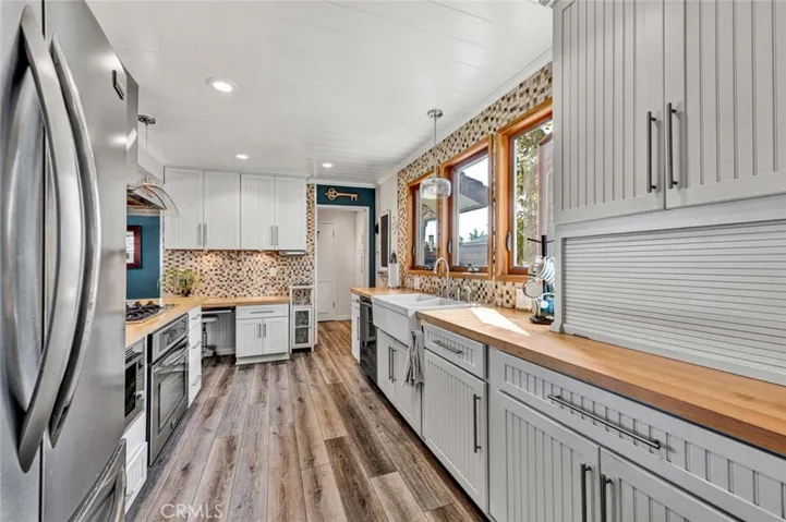 Step inside this beautifully updated home that blends classic charm with thoughtful modern upgrades and tasteful design. A custom iron front door with integrated screen sets the tone and you will appreciate every attention to detail. Newer LVT flooring, interior paint, updated baseboards, newer interior doors, and stylish fixtures. The remodeled kitchen is a true showstopper, featuring a neutral backsplash, beadboard cabinetry, farmhouse sink, Boos butcher block countertops, shiplap ceiling, recessed lighting, pull-out pantry, and drawers with soft-close functionality. Newer appliances include a Frigidaire stove, dishwasher and microwave. Breakfast bar with seating for four opens seamlessly to a dining room enhanced by shiplap ceiling and a Hampton Bay ceiling fan. The living room is bright and welcoming with a skylight and the focal point is the striking stone fireplace and hearth with both gas and wood-burning options. Dimmer switches in both the living room and kitchen allow for customized ambiance. Tastefully updated bathrooms. One stylish bath features newer tile floors and a rock floor shower for a spa-like feel. A highlight is the additional approx 300 sq ft bonus room offering versatile space ideal for home office, gym or relaxing retreat. Major system upgrades provide peace of mind. New plumbing was professionally relocated from the slab to the ceiling, newer electrical panel, tankless water heater, and energy-efficient Milgard double-pane casement windows in the kitchen and Jensen windows throughout. Car enthusiasts and hobbyists will appreciate the exceptional parking and storage options, including a spacious approximately 450 sq ft garage with 10-foot ceilings, and a 7’7” door. A second 11’ x 19’ garage with full-size laundry, and a separate covered carport. The oversized driveway accommodates multiple vehicles and an R.V. up to 35 feet. Outdoor living is elevated with two separate patios featuring classic Spanish tile floors. A private hot tub, two fountains, and a 40-inch TV create an inviting space idea for casual entertaining and enjoying the coastal living year round. Mature landscaping includes an avocado tree, fragrant plumeria and jasmine. This property offers value, versatility and opportunity for buyers, investors, and multi-generational families looking for ADU potential. Boasting an excellent walkability score, this location offers nearby conveniences like shopping, dining, Central Park and Library. Quick drive or bike to the beach.