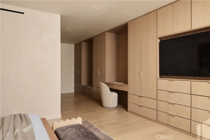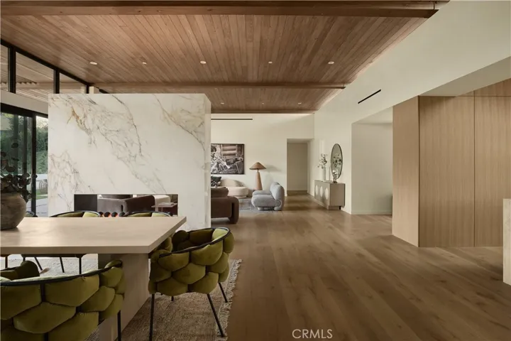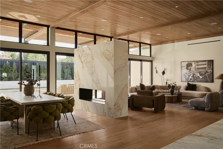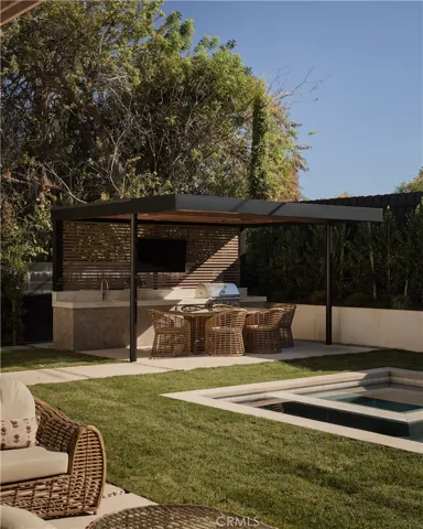 An iconic Charles Du Bois mid-century home, thoughtfully and completely reimagined by Wyota Workshop, blending timeless architectural integrity with modern volume, warmth, and livability. This 4-bedroom, 3.5-bath residence honors the original spirit of Du Bois’ design while elevating it for contemporary living. The home’s layout has been reworked to introduce a dramatic 36-foot-long living room with 12-foot ceilings, creating an expansive sense of scale and light rarely found in homes of this era. A cantilevered ceiling extends seamlessly toward the outdoor patio, reinforcing true indoor-outdoor living and allowing the interior spaces to flow effortlessly into the landscape. Throughout the home, custom oak cabinetry has been meticulously designed and built in every space, offering warmth, cohesion, and exceptional storage without compromising clean architectural lines. The dining room is anchored by a refined wet bar with wine refrigeration, making it ideal for entertaining. The kitchen is both sculptural and functional, featuring Thermador appliances, natural Taj Mahal quartz countertops, and a striking waterfall island that serves as the heart of the home. The residence offers dual primary suites, thoughtfully positioned on opposite sides of the home to provide privacy and flexibility perfect for guests, in-laws, or work-from-home needs. Outside, the property continues to impress with a modern linear pool and spa, a covered outdoor BBQ area, and multiple zones designed for relaxation and entertaining. A poured-in-place concrete firepit with custom bench seating anchors the yard, while a fully integrated indoor-outdoor sound system sets the tone for gatherings both intimate and lively. Every system in the home has been updated this is a fully rebuilt residence, offering the confidence of new construction with the soul of a mid-century classic. A rare opportunity to own a true architectural masterpiece rooted in history, redefined for modern life, and perfectly suited for the Woodland Hills lifestyle.