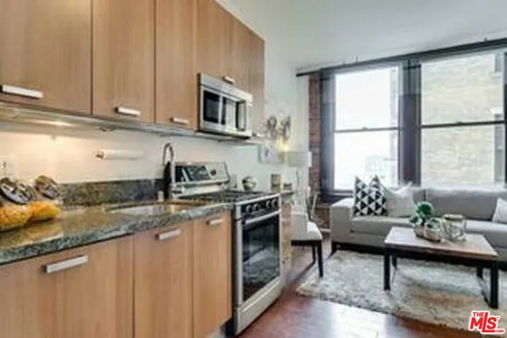 This stunning open-concept loft is located in the historic ROWAN building in DTLA. Recently remodeled, it blends modern style with the original charm of the 1912 brickwork, and features sleek hardwood floors throughout. The large windows invite natural light into the space, which leads to a kitchen equipped with top-of-the-line stainless-steel appliances, granite countertops, and a matching backsplash. With plenty of space, this unit offers a comfortable work-from-home setup. The living area exudes a warm, inviting vibe that transforms into a cozy retreat when you lower the blinds. Beyond the living room, you’ll find a peaceful bedroom, complete with an in-unit Bosch washer and dryer. The private bathroom is designed with black tile floors, a large mirror, and a spacious granite countertop, offering the perfect space to relax with a shower or bath. Located near popular attractions such as The Last Bookstore, Grand Central Market, Perch, and Pershing Square, this loft is ideally positioned for easy access to everything DTLA has to offer.