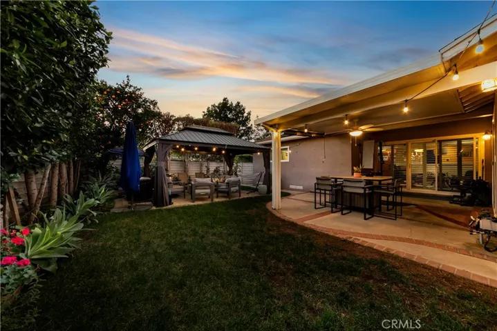 Step outside to a private backyard retreat where mature fruit trees frame a welcoming outdoor living space. A covered patio, family-sized gazebo, and fire pit create the perfect setting for relaxing evenings or hosting memorable gatherings with friends and family.