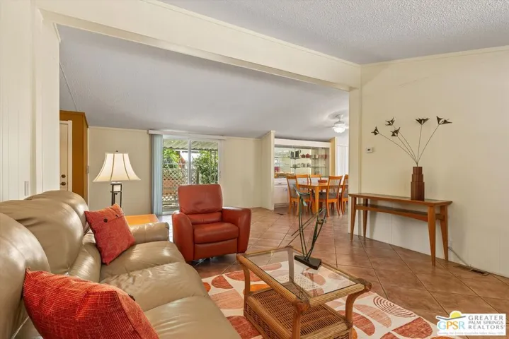 Dramatic mountain views enhance this open and light home behind the guarded entrance of Cathedral City’s beautiful Date Palm Country Club. A free-flowing floorplan makes entertaining and daily living equally enjoyable in the single-level design, which features two bedrooms and two baths in approximately 1,536 square feet. A private side entry provides a welcoming introduction, leading to a spacious living room and a large dining room with built-in cabinetry and glass display shelving. Wrapped in floor-to-ceiling windows, the sitting room joins a large kitchen to create a great room-style setting with gorgeous views straight out to Mount San Jacinto. An island with bar-height seating takes center stage in the kitchen, where chefs of all skill levels will appreciate solid-surface countertops, white cabinetry with a built-in pantry, ample prep space, and a full suite of appliances including a gas cooktop. Bedrooms are comfortable and private, with the primary suite highlighted by an ensuite bath with two sinks, a soaking tub and separate shower. Vaulted ceilings lend an airy ambiance in every room of the home, which is appointed handsome tile flooring throughout, ceiling fans and mirrored wardrobe doors. Outdoors, a large wraparound patio leads to a backyard with some of the best mountain views in the community. Enjoy a variety of mature fruit trees, a carport and a spacious shed/workshop. A popular choice among active adults 55 and better, Date Palm Country Club presents a carefree resort environment that features an 18-hole golf course, pro shop, large newly remodeled clubhouse, restaurant, three pools and spas, tennis and pickleball courts, a fitness center, dog park, library/meeting room, lush greenbelts and scenic lakes. The theaters, restaurants, shops and park in Cathedral City’s revitalized downtown are moments from home, and Palm Springs and Rancho Mirage are just minutes away.