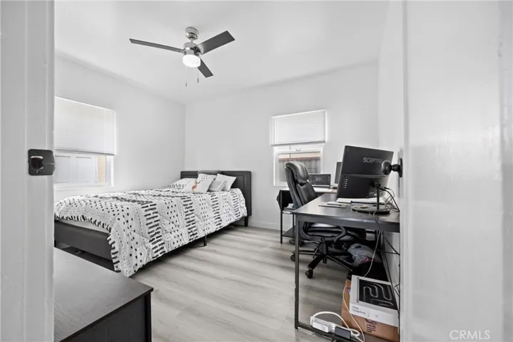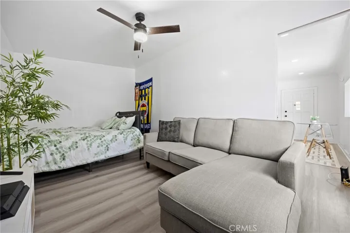 The property consists of two separate buildings. The front structure is a detached 2-bedroom, 1-bath single-family residence featuring a bonus room – ideal for a home office, playroom, or potential conversion to a third bedroom. The home has been updated with vinyl flooring, smooth ceilings, recessed lighting, and a fenced front yard, offering a private, residential feel.
