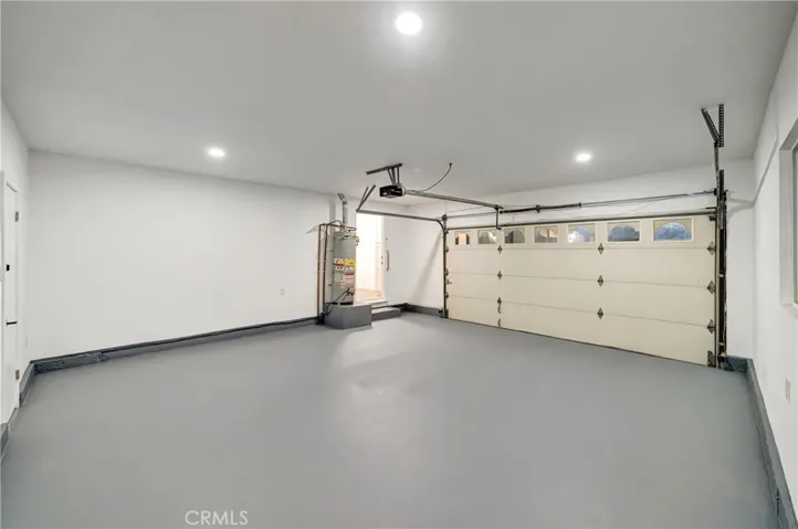 A gated front entry leads to an oversized driveway and finished two-car garage with epoxy flooring and recessed lighting. Inside, wide-plank wood floors, recessed lighting, and a bright neutral palette set a refined tone. Vaulted ceilings with exposed beams and expansive picture windows draw the eye outward, flooding the living spaces with natural light while showcasing open hillside and valley views.