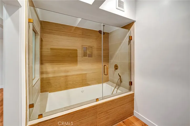 The primary suite is a private retreat positioned to enjoy the views, offering generous space, abundant light, and a spa-inspired en-suite bathroom with floating wood vanity, quartz counters, designer fixtures, soaking tub, frameless glass, and refined tilework. Secondary bedrooms are spacious and bright, while additional bathrooms continue the cohesive modern aesthetic with walk-in showers and contemporary finishes.