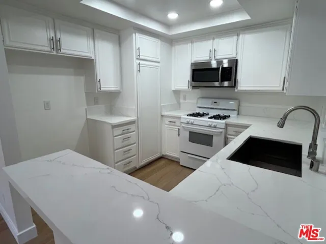 Wonderful opportunity to live in a remediated and renovated, bright 2-bedroom, 2 bath end unit in the Palisades Highlands. A spacious entry patio leads you into a large living area with fireplace and vaulted ceilings. A convenient dining area is adjacent to an open kitchen featuring a new sink, quartz countertops, microwave, stove and dishwasher. Both bathrooms have been updated and feature new quartz countertops, vanities and hardware. The entire interior has been painted, new flooring installed, and both bedrooms have ample closet space and plantation shutters. Rheostat lighting has been installed throughout the space, and a new heating and air conditioning system keeps things comfortable through the seasons. A renovated stairway leads to an oversized 2-car attached garage with separate workspace. The unit location is ideal and within close proximity to a sparkling community pool and spa and recreation area. Come enjoy the Highlands!
