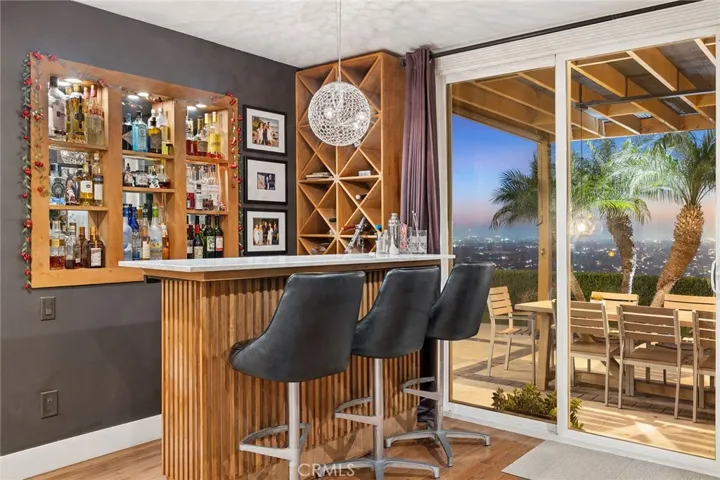 Set on a single-loaded cul-de-sac in one of the most coveted Panorama Heights enclaves, this exceptional mid-century modern residence offers what hillside properties rarely do: breathtaking unobstructed views, effortless access, and a remarkably usable outdoor setting. Spanning 2,320 square feet on an expansive 12,400 square-foot lot, the home is thoughtfully designed for seamless indoor–outdoor living. From the main living room, a large sliding glass door opens to dramatic elevated city and ocean views, where twinkling city lights, nightly fireworks, and sweeping horizons become part of everyday life. A beautifully positioned dry bar adjacent to the living area enhances the mid-century modern aesthetic, creating an ideal setting for entertaining while taking in the view. With no telephone lines, poles, or homes across the street, the sightlines remain wide open and completely uninterrupted. Unlike many hillside homes, this property offers level entry from the garage directly into the main living area—no stairs, no steep driveway, no compromises. The flowing main level connects the family room, kitchen, and living spaces, all oriented toward the view and outdoor entertaining areas. Every bedroom is conveniently located on one level upstairs, and nearly every room enjoys its own city-light view, creating a consistently magical experience throughout the home. The outdoor spaces are a true standout. The primary yard adjacent to the home is flat, fully usable, and wraps around the residence, offering easy access from both the driveway and street—an exceptional feature for view properties. Behind the home, a natural rock hillside provides privacy and a tranquil backdrop, creating an ideal shaded entertaining area during warm summer afternoons. Across the private street, an additional landscaped hillside portion of the lot enhances privacy and preserves open sightlines, helping protect the views. Architecturally distinctive and fully finished with nothing left to do, this is a rare opportunity to enjoy a mid-century modern home that balances design, comfort, and practicality—offering the best of hillside living without the typical challenges. Centrally located in Orange County (about 40 miles south of Los Angeles), just 30 minutes to Newport Beach and 20 minutes to Orange County Airport. Choice of the excellent award-winning Orange schools or the Tustin schools Arroyo, Hewes and Foothill. #HollywoodhillsofOC