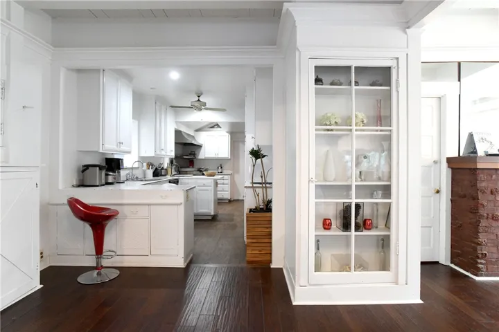 The original home features an airy, sun-filled open-plan great room with brick fireplace, dining area, and a spacious kitchen equipped with a Wolf range and a vintage commercial-style stock-pot burner—a distinctive culinary centerpiece echoing the home’s eclectic heritage. Three bedrooms and three baths complete the original Craftsman portion of the home, before transitioning to the formally permitted 1991 expansions. A gated front patio offers peaceful outdoor living with effortless access to the walk street’s coastal vibrancy, and a second-floor balcony captures a natural ocean-view corridor. Per seller, the home includes multi-zone climate systems serving different areas of the residence; buyer to verify all cooling and heating details independently.
