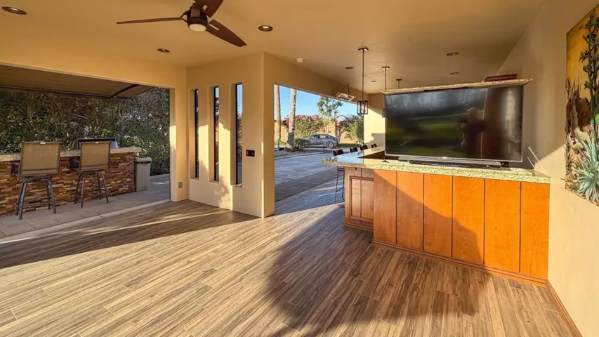 Outdoor Resort Indio is a Class A Motorcoach resort. This is an RV lot. Discover exceptional luxury and functionality on this expanded 2,613 sq ft RV lot, featuring a beautifully finished pergasita with a pitched tile roof, privacy walls, windows, and wrap-around screens. Designed for true indoor-outdoor living, the pergasita offers tile flooring, a large residential-style kitchen with granite countertops, full-size refrigerator, oven cooktop, under-counter microwave, dishwasher, abundant upper cabinetry, ceiling fans, ceiling heaters, and a wrap-around bar–complete with a pop-up, swiveling TV for entertaining. A bathroom is also included, and the structure is thoughtfully built to accommodate future glass doors for those wishing to convert it into a full casita.Outside, enjoy a small barbecue kitchen/bar with a granite counter and natural stone facade, plus an extending shade awning. Pavers and a coated concrete pad run throughout the lot, creating a clean and cohesive outdoor living space.This premium location showcases spectacular southern views overlooking a rare river/waterfall view, the golf course bridge, and mountains rising beautifully in the distance. Suitable for a coach up to 43 feet, this one-of-a-kind lot blends resort luxury with stunning scenery and exceptional craftsmanship.