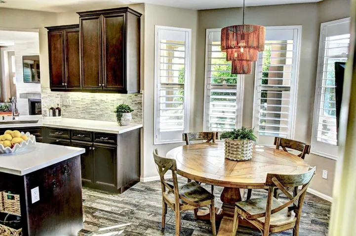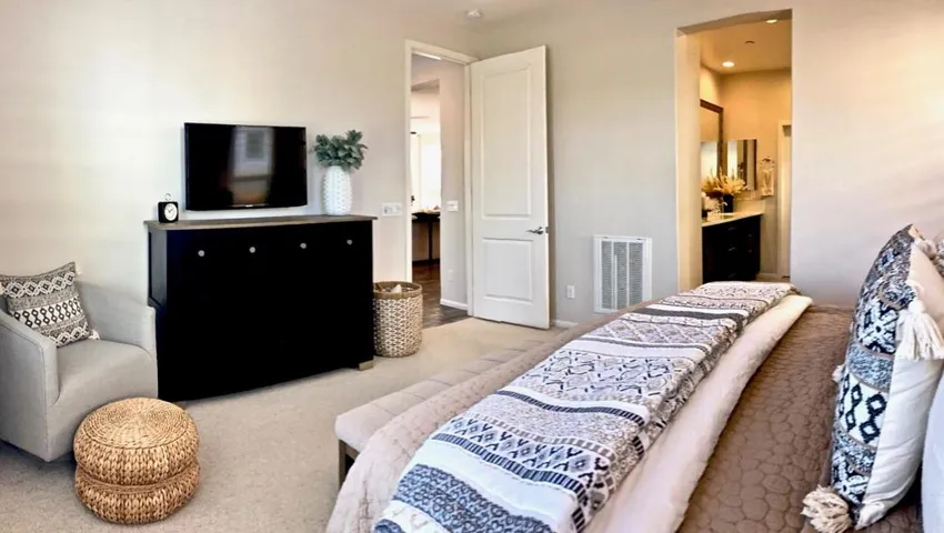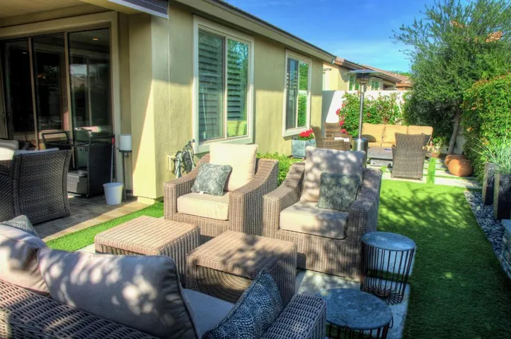 Start the new year with the perfect desert retreat! This spectacular home is located in the 55+ section of the community that’s a short distance to the clubhouse and community amenities. This Monaco model with over 1600SF has 2 bedrooms and 2 bathrooms. Upgrades in this contemporary home include fireplace in the great room, firepit in back yard, and soothing fountains in entry courtyard and backyard. The home features solar power with approximately 9+ years remaining on prepaid lease. The eat in Kitchen includes Jenn-Aire appliances. Elegant finishes include quartz countertops, custom backsplash, and upgraded cabinets with abundant storage. The open living space includes great room, dining room, den, and kitchen. Access the patio and rear yard from a large rolling wall of glass. The home features recessed lighting, designer tile flooring throughout primary living areas in home, upgraded carpet in bedrooms, designer 2 tone paint finishes and more! The primary bath has an oversized tiled shower with bench, dual sinks, and quartz countertops. If you choose to become a member of the clubhouse, club amenities include tennis/pickleball courts, fitness center, resort/lap/fitness pools & spa, poker/billiards room & artisan studio. Community also features putting green, bocce ball court, large chess game area, and walking trails.
