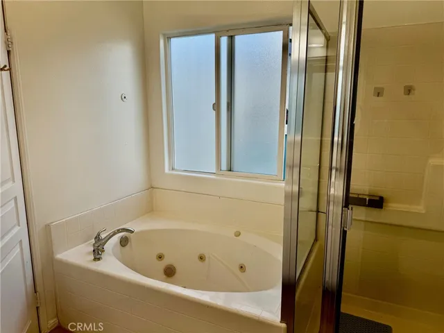 The oversized primary suite is a standout, offering high ceilings, recessed lighting, a walk-in closet, and a beautifully updated bathroom with a double-sink vanity, shower, and soaking tub. Three additional well-sized bedrooms and two full bathrooms provide plenty of space for family, guests, or a home office setup.