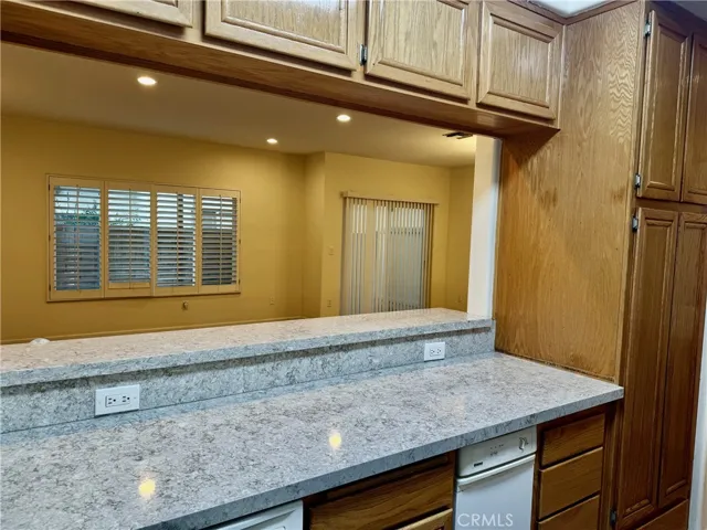 The kitchen opens seamlessly to a large living room featuring a cozy fireplace, smooth modern ceilings, recessed lighting, and a sliding door that leads to your **own private patio**, perfect for relaxing or entertaining.