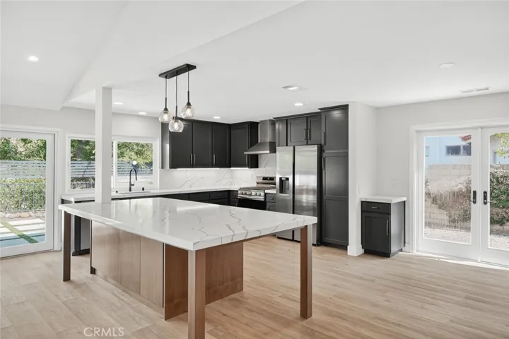 Discover this beautifully designed 4-bedroom, 2-bathroom single-story home offering 2,038 sq ft of open and inviting living space. The open floor plan is filled with abundant natural light from large glass doors and multiple windows, creating a bright and airy atmosphere throughout. The kitchen is both stylish and functional, featuring a center island perfect for casual dining, along with ample counter space and generous storage. The living room serves as a stunning focal point with a dramatic floor-to-ceiling fireplace, ideal for relaxing or entertaining. Situated on a spacious 9,583 sq ft lot, the exterior is equally impressive with a modern permeable patio and a large in-ground pool that thoughtfully wraps around the corner of the home, maximizing outdoor living space. This home seamlessly blends comfort, design, and indoor-outdoor living.