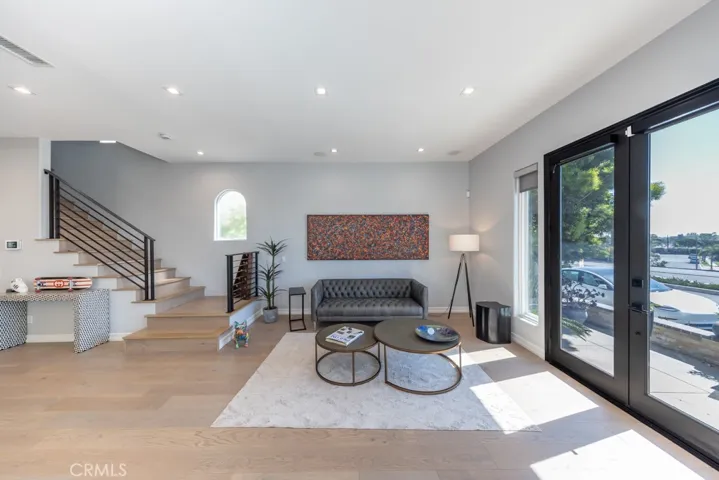 From the curb, the home presents a contemporary exterior with a front patio and landscaped entry. Inside, the main level opens to expansive living and family areas with high ceilings, recessed lighting, and white French oak wood flooring. Multiple fireplaces define the living spaces and connect seamlessly to outdoor patios, creating a functional indoor and outdoor flow.