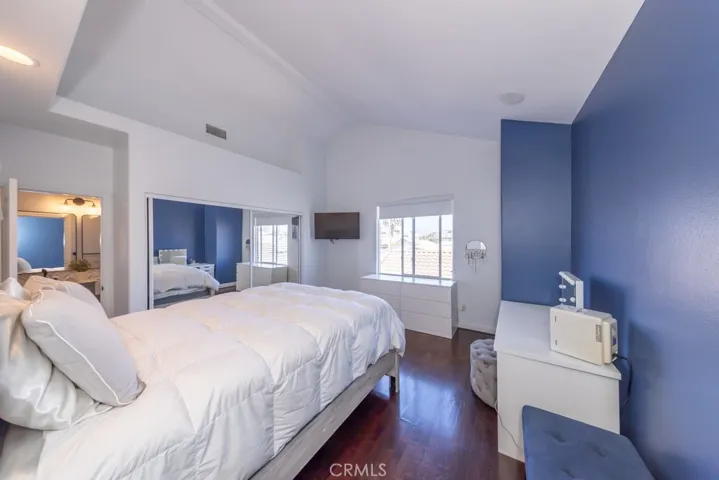 All bedrooms are located on the upper level. The primary suite includes a fireplace, private balcony with ocean and city views, a walk-in closet, and an en suite bath with dual sinks, soaking tub, marble finishes, and a separate tiled shower. Two additional bedrooms feature wood flooring and share a Jack and Jill bathroom with updated finishes. A fourth bathroom on the main level provides added convenience.