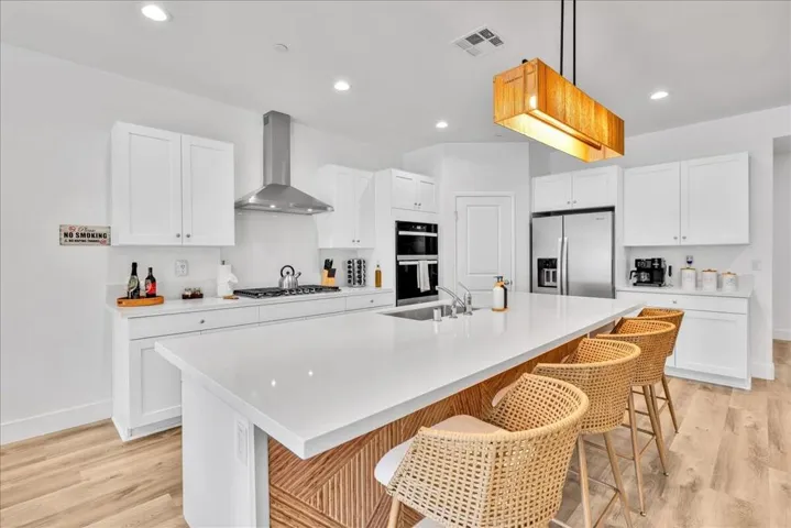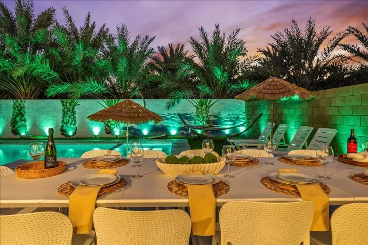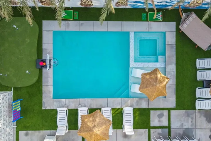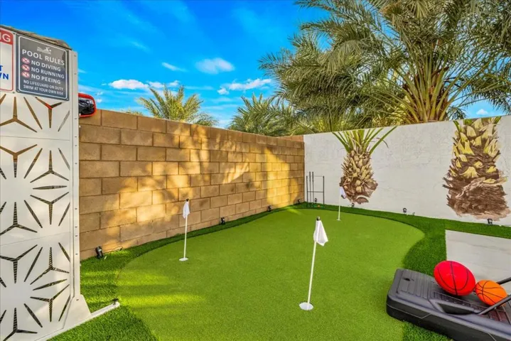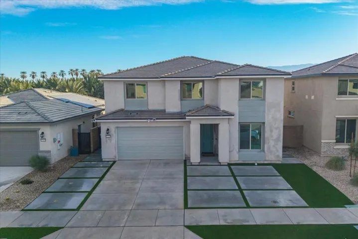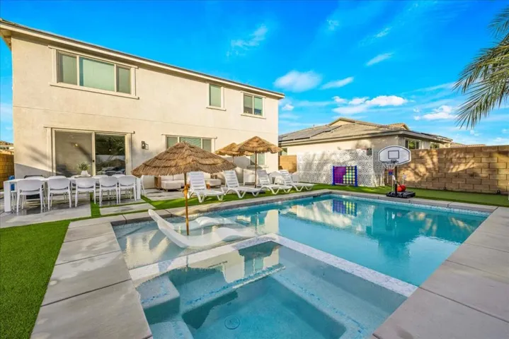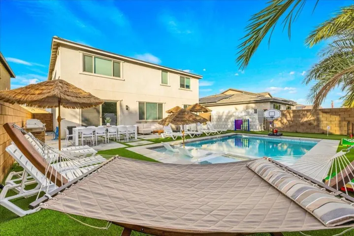 Property permits short-term rentals with a minimum stay of 30 days. Rental rates are subject to change based on seasonality and local events. Stunning brand new 2025 construction offered fully furnished and designed for modern resort style living. This turnkey home features an open concept layout filled with natural light, wide plank flooring, recessed lighting, and stylish designer finishes throughout. The contemporary kitchen showcases sleek cabinetry, stainless steel appliances, a gas cooktop with modern hood, expansive countertops, and a large island that flows seamlessly into the dining and living areas, perfect for entertaining. The living room is highlighted by a custom accent wall and thoughtfully curated furnishings included with the sale. Step outside to a private backyard oasis featuring a brand new saltwater pool and spa, surrounded by modern hardscape, artificial turf, lush palm-lined privacy, and dramatic landscape lighting for evening ambiance. The outdoor space is ideal for entertaining and relaxation, offering multiple lounge areas, outdoor dining, bbq ,a fire pit, putting green, recreational game areas, and basketball hoop. Additional highlights include solar panels for energy efficiency, all new systems, a game ready garage space, and an indoor laundry room with two washer’s and two dryer’s included. With low maintenance landscaping and every detail carefully designed, this home is truly move in ready and ideal as a primary residence, second home, or investment opportunity. A rare chance to own a fully furnished, new construction home with a saltwater pool that shows beautifully and delivers effortless luxury living.