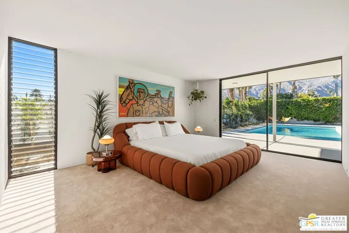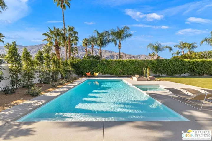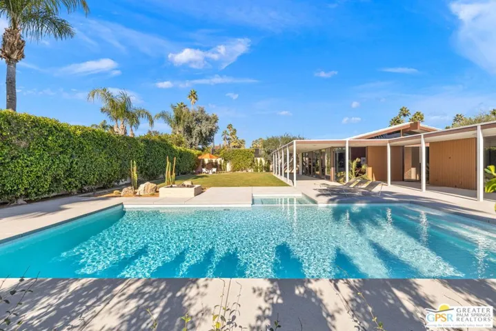 Designed in 1969 by Hugh Kaptur, AIA, and thoughtfully restored in 2025 with his blessing, this exceptional single-level post-and-beam residence reflects the architectural clarity and restraint that define Kaptur’s most enduring work. Located on an ultra-private cul-de-sac in the heart of Movie Colony, the home honors its pedigree while presenting with renewed integrity. Clean lines, open-plan interiors, and rhythmic colonnades establish a strong architectural framework, while expansive walls of floor-to-ceiling glass and sliding doors dissolve the boundary between indoors and out. Mountain views unfold to the west, with nearly every room opening directly to the landscape. The light-filled living room is a signature moment defined by vaulted, exposed-beam ceilings, warm wood-paneled walls, integrated built-ins, and a substantial fireplace anchoring the space. Clerestory windows and a serene interior atrium further enhance this area’s connection to light and nature. The adjacent kitchen is crowned by floating light panels and features Walnut colored cabinetry, stone countertops, Fisher & Paykel appliance suite, and a pass-through to the dining area reinforcing the home’s original modernist flow. All primary living spaces extend to a covered patio overlooking the ultra-private south and west-facing backyard, where Mount San Jacinto views frame a pool and spa, open-air fireplace, and generous lawn creating an elegant extension of the architecture itself. The west-facing Primary Ensuite opens directly outdoors and includes dual sinks, a south-facing walk-in shower with views, and a custom walk-in closet. Junior Ensuite Two opens to the front courtyard and enjoys a private bath with walk-in shower. Bedroom Three offers pool and mountain views, while a hallway powder bath serves guests. Just moments from downtown Palm Springs, this is a rare opportunity to own an authentic, architect-restored Kaptur residence in one of the city’s most cherished neighborhoods. Ideal for full or seasonal enjoyment as well as those seeking a prominent short-term vacation rental.