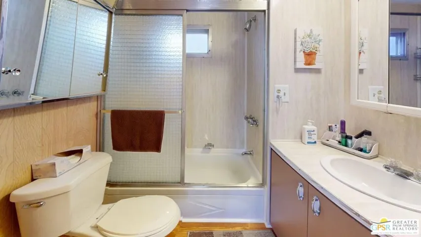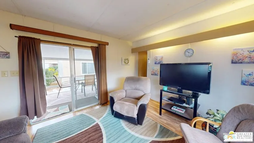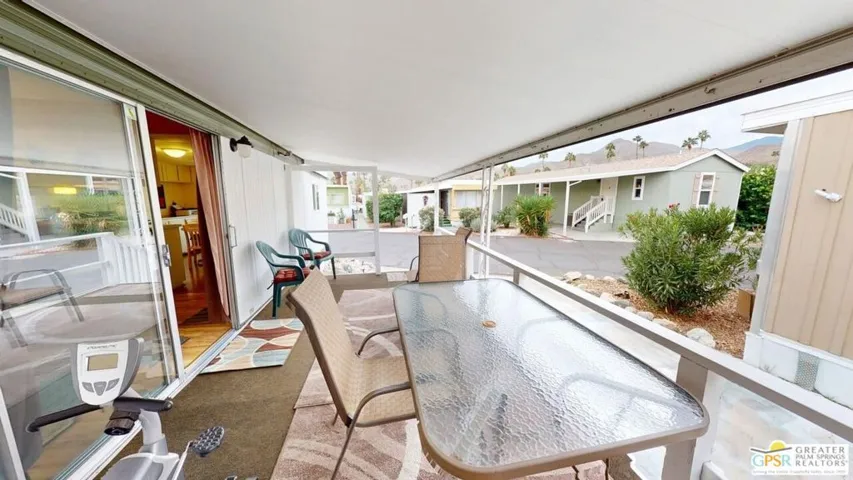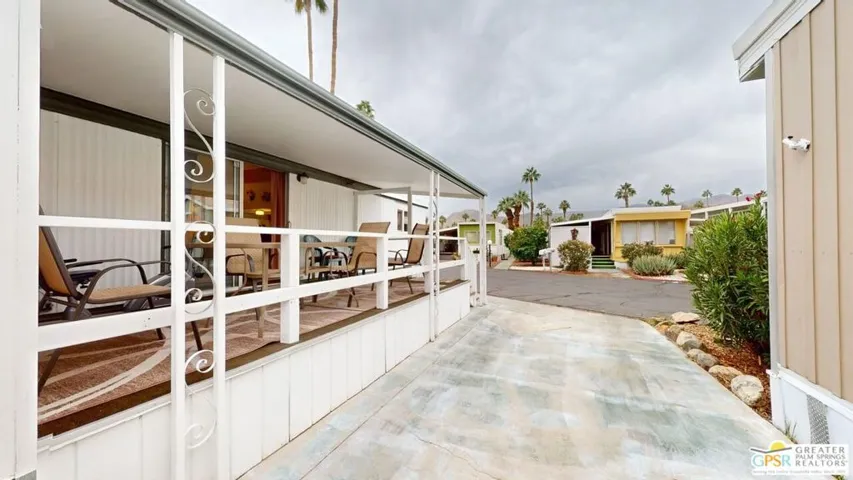 Furnished home in Tramview, the 55+ community, with 2 Bedrooms and 2 Baths – one with Tub/Shower and one with a Shower Stall. The Primary Bedroom has direct access to one of the hall baths. The second Bathroom, which is the hall/guest bath, features the stackable Washer & Dryer. The light and bright Living Room, with access to the eat-in Kitchen, is a highlight of this great residence. The home is outfitted with 3 mini splits which help to cool and heat the home – one is located in the Living Room/Kitchen area and the other two are located in the bedrooms. The covered deck entry affords awesome views of the iconic Mt. San Jacinto to the west. There are a variety of updated dual pane windows throughout this lovely home. By the way, “Mrs. Clean” lives here! There are two parking areas for this property – one is “front-load” from Garfield and the other one is a covered carport next to the large shed with work bench and storage, at the rear off the alley. The home is being sold furnished and the inventory list can be found in the listing disclosures. Located in the Popular Tramview Mobile Home Community, it offers a large heated pool and spa, clubhouse with kitchen area, card tables, billiards table. Close to Target, Trader Joe’s, Bart’s Bar and the Roost!