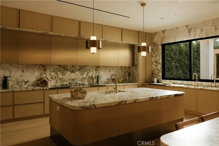 Introducing a masterfully crafted gated estate that redefines luxury living, privacy, and scale in the heart of Encino’s prestigious Royal Oaks enclave. Designed by acclaimed architect Eran Gispan and elevated by bespoke interiors from Sophea Design, the residence delivers a seamless balance of modern sophistication and resort-style living—crafted at the highest level. A grand circular motor court with paver detailing, and two mature olive trees creates a timeless sense of arrival and privacy. Inside, soaring two-story ceilings, hand-applied plaster walls, and warm wood detailing frame a light-filled, open floor plan. Wide-plank white oak floors extend throughout the entire home. The kitchen is a true statement of form and function, anchored by a double island wrapped in dramatic Calacatta Viola marble, Custom white oak cabinets, premium Miele appliances, and a separate prep kitchen with walk-in pantry. Adjacent to the dining area, a serving bar with limestone countertops and backsplash enhances entertaining flow, while the family room is defined by a sculptural travertine stone. The main residence features six bedrooms, all en-suite, in addition to an office, a dedicated movie theater, gym, lounge and game room. The primary suite is a private sanctuary, highlighted by a private balcony and a spa-inspired bath wrapped in leathered Taj Mahal stone, complete with a skylit shower that fills the space with soft natural light. Designed for year-round enjoyment, the grounds unfold as a true private resort. The expansive backyard includes an oversized pool with spa, sunken firepit, basketball court, putting green, generous grassy yard, and a fully equipped outdoor kitchen and barbecue—ideal for both intimate evenings and large-scale entertaining. Completing the compound is a detached guest house featuring one bedroom, one bathroom, and a living area, offering exceptional flexibility for guests, extended family, or a private studio. Additional highlights include a four-car garage, expansive gated driveway, exceptional privacy throughout, and a full Control4 smart-home system managing lighting, climate, interior and exterior audio, alarm system, and security cameras. Located moments from Ventura Boulevard’s premier dining and boutique shopping, and within the highly coveted Lanai Road School District. This one-of-a-kind estate offers the scale of a private compound, the sophistication of a designer residence, and the lifestyle of a world-class retreat.