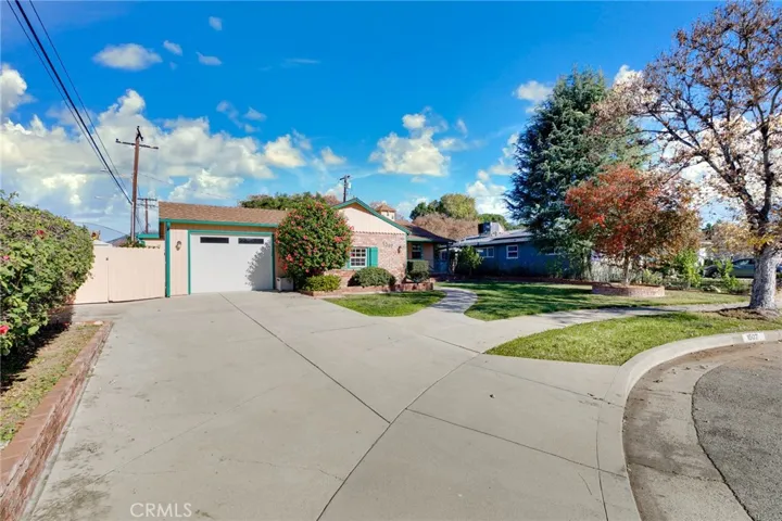 Welcome home to this charming single-story gem nestled on a corner lot in a quiet cul-de-sac, just walking distance to the elementary school. Freshly painted inside and out, this home is full of curb appeal and character. Inside, enjoy hardwood floors throughout with brand-new laminate flooring in the primary bedroom, dual-pane windows, crown molding, and LED recessed lighting that create a bright, welcoming feel. The living room features a large picture window and flows into the dining area with a built-in oak hutch. The kitchen offers granite countertops, oak cabinetry, a farmhouse sink, a brand-new dishwasher, and a built-in microwave. Gather in the family room with a classic brick fireplace and direct backyard access. The spacious primary bedroom features a built-in desk, along with two additional bedrooms, a full hall bath, and a separate laundry room with built-in cabinetry and a wine refrigerator. Enjoy the backyard with a covered Trex patio, ideal for relaxing or hosting guests. 1-car attached garage with pull-through access to an oversized detached 1-car garage with great ADU potential. Move-in ready and easy to fall in love with!
