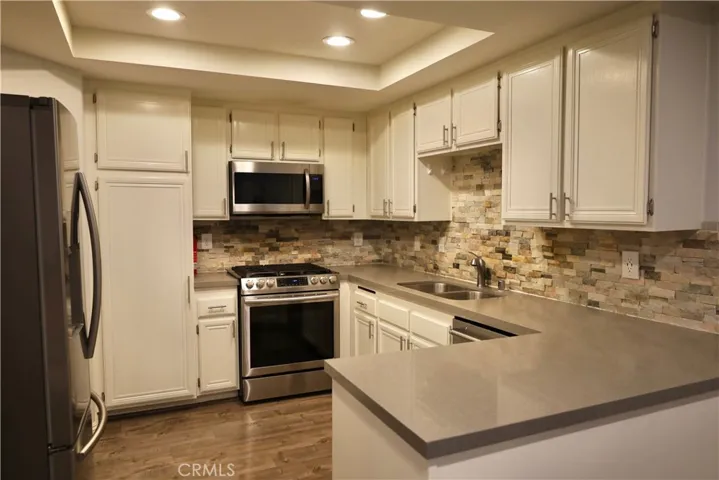 The light and bright updated kitchen showcases quartz countertops, tile/stone backsplash, and newer stainless steel appliances, all included in the sale: refrigerator, stove, microwave, dishwasher, and front-loading washer and dryer.