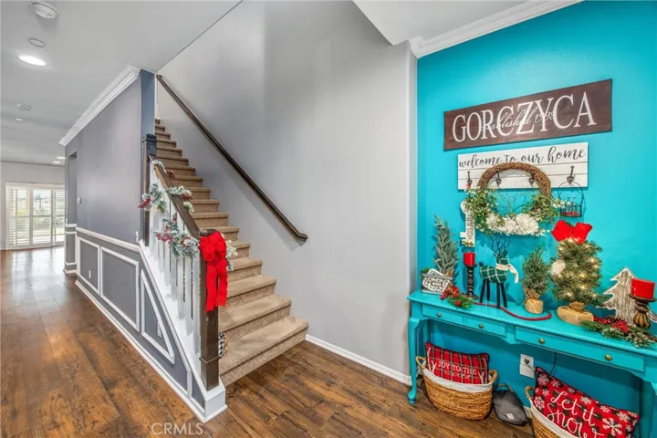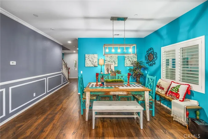 Inside, the open-concept layout keeps everyone connected. The chef’s kitchen flows seamlessly into the great room and features quartz countertops, abundant cabinetry, a separate pantry, and a seller-added designer backsplash with updated lighting. The oversized island—expanded to double the original builder size—creates the perfect hub for entertaining, homework, or game night, while a spacious breakfast nook and large dining area make hosting easy. Elegant touches throughout include crown molding, Wainscoting with custom wall trim detail, plantation shutters, and high-quality wood laminate flooring.