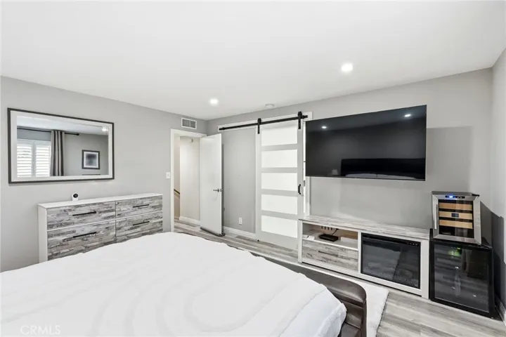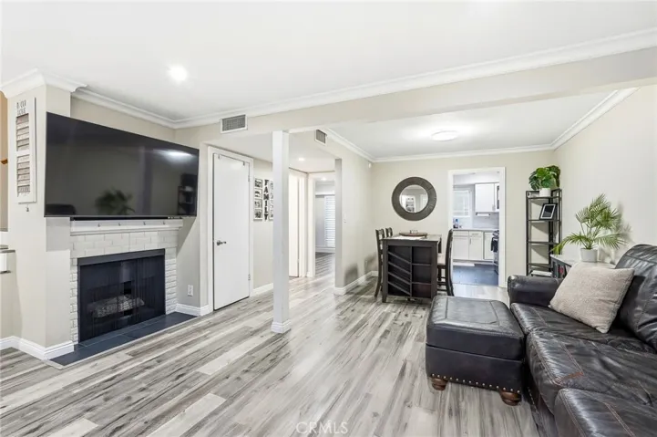 The light-filled living room features wide windows with custom wood shutters, recessed lighting, upgraded gray laminate flooring, wet bar, and a fireplace, flowing seamlessly into the dining area perfect for entertaining. The spacious kitchen boasts quartz countertops, a modern backsplash, glass-front cabinetry, and stainless steel appliances, ideal for cooking and gatherings.